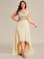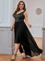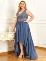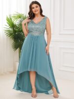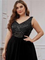 Hold your hearts because this stunning evening dress would make you look like a princess. This plus size evening dress for mature woman features a deep V-neck and is sleeveless. The A-line silhouette of the dress makes it look high-end and fabulous. The paillette designing on the upper body looks stunning as well. This gorgeous dress is perfect for all formal occasions, from evening party, cocktail, weddings to prom, homecoming and graduation!