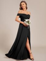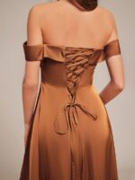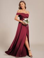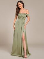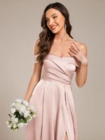 This off-shoulder satin bridesmaid dress offers a blend of sophistication and allure. The lace-up back allows for a customizable fit, while the high slit adds a touch of drama and elegance. The luxurious satin fabric drapes beautifully, making it perfect for modern bridesmaids who want to make a stylish statement at any wedding or formal event.