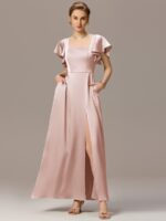 Satin Square Neck Short Sleeve Ruffled Maxi Bridesmaid Dress with Pockets